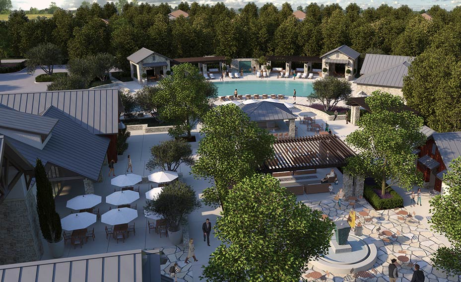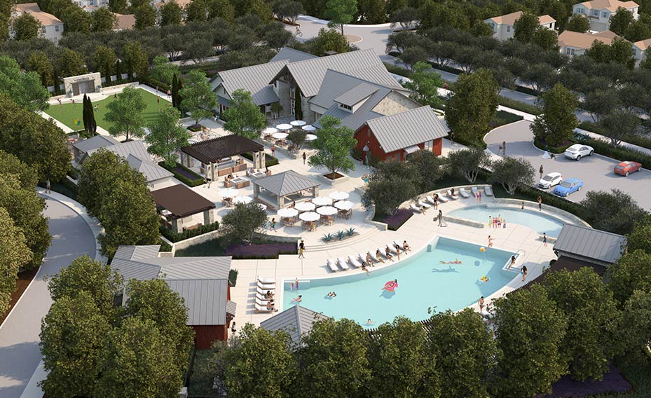 The expansive exterior grounds of The Lodge at Riverstone will feature a resort-style pool and a children’s pool as well as an array of amenities including comfortable gathering places and an outdoor bar with firepits.